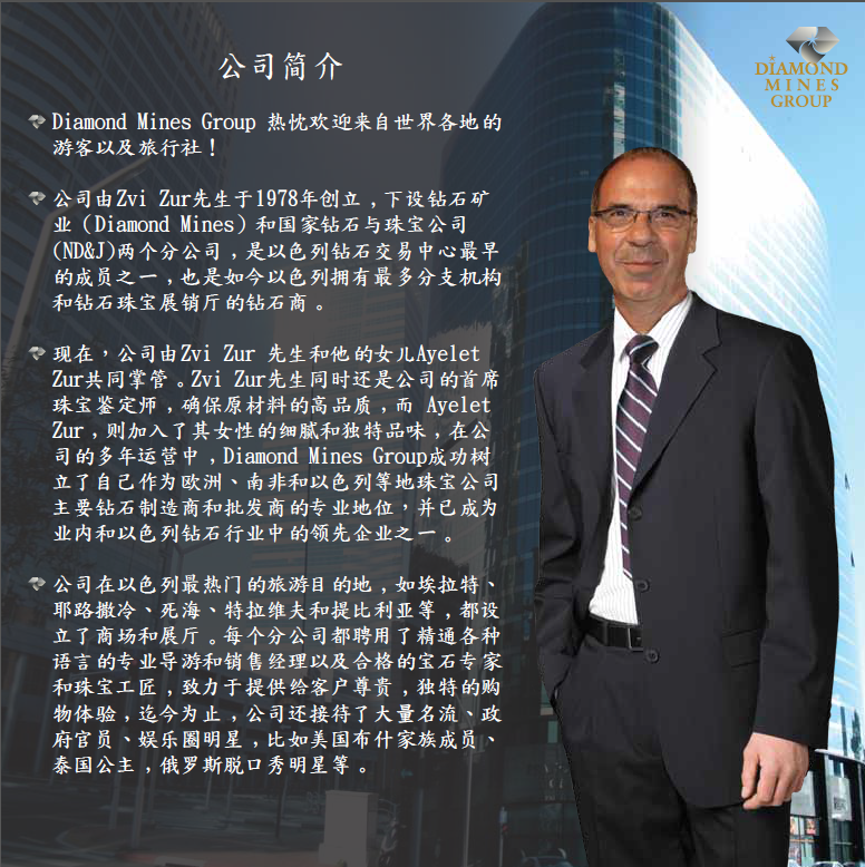 以色列钻石矿业集团,(Diamond Mines Group)是以色列钻石行业中比较典型和领先的企业,公司由Zvi Zur先生于1978年创立,下有钻石矿业(Diamond Mines)和国家钻石与珠宝公司(ND&J)两个分公司,是以色列钻石交易中心最早的成员之一,也是如今以色列拥有最多分支机构和钻石珠宝展销厅的钻石商。