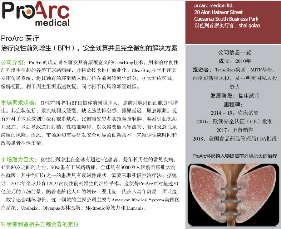 ProArc的成立旨在研发具有颠覆意义的ClearRing技术,用来治疗良性前列增生引起的各类下尿路病症,并将此技术推广商业化。ClearRing技术利用其专用传送系统,将其独有的环形植入物定位在前列腺增生部分,扩大相应区域,缓解梗阻,利于周边组织迅速恢复,同时将不良风险降至最低。