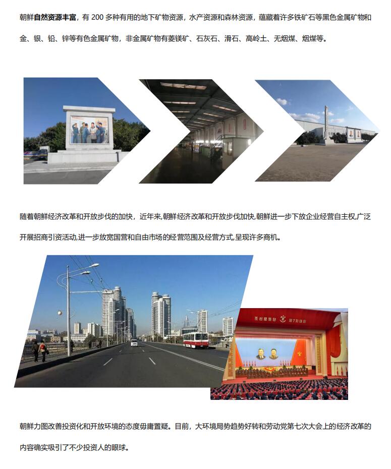 朝鲜力图改善投资化和开放环境的态度不能质疑。目前,大环境局势趋势好转和劳动党第七次大会上的经济改革的内容确实吸引了不少投资人的眼球。