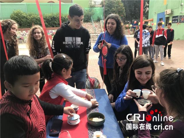 中国小朋友给以色列中学生献上中国茶。(摄影 孙伶俐)