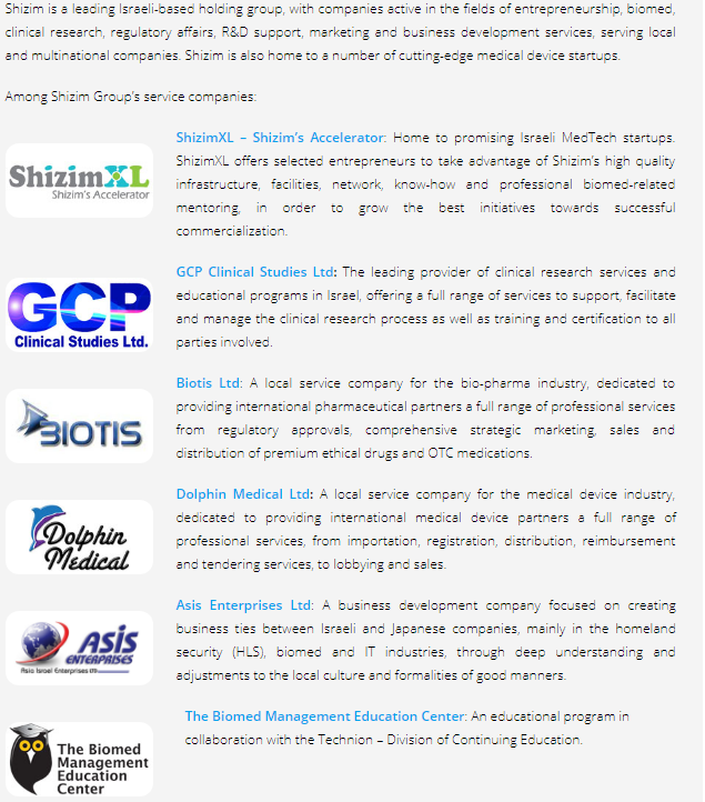 Shizim是以色列Israeli-based控股集团,公司在创业领域的活跃,生物医学,临床研究、法规事务、研发支持,市场营销和业务发展服务,服务本地和跨国公司。Shizim也是许多尖端医疗设备公司。