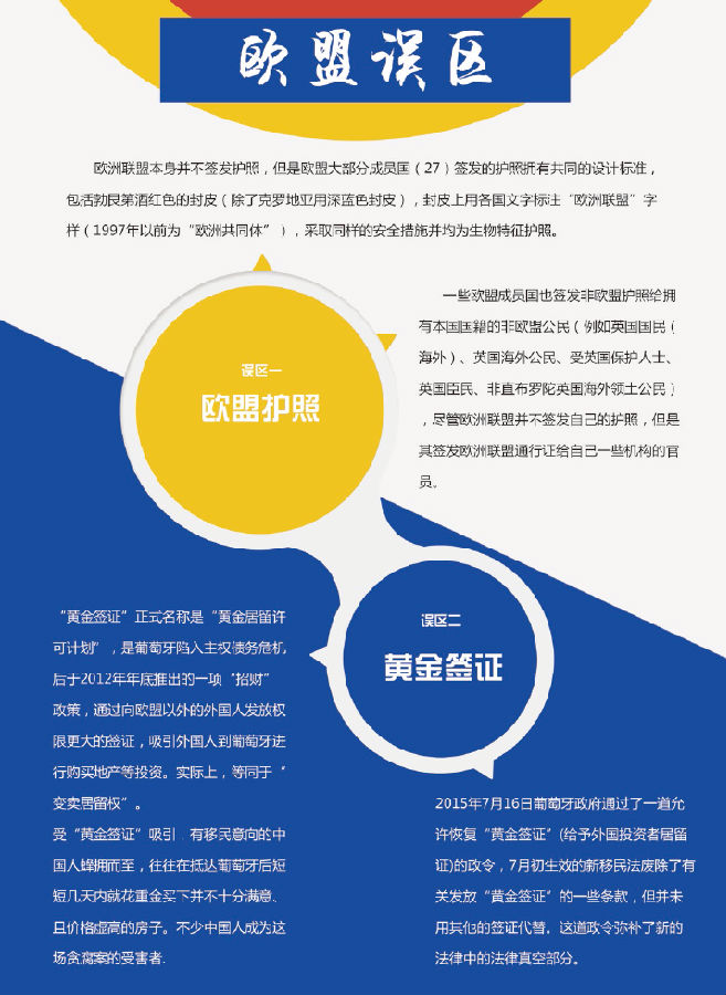 黄金护照:这种护照的签发国是葡萄牙和希腊,目前是暂停项目,这种护照其实是一种签证,就是在非欧盟国家人员的护照上贴好一个签证,这个签证可以全球一百多个国家免签,出现这种签证的原因是希腊和葡萄牙国内经济危机,为了吸引更多的非欧盟国家人员将资金用于该国来活跃经济的手段。