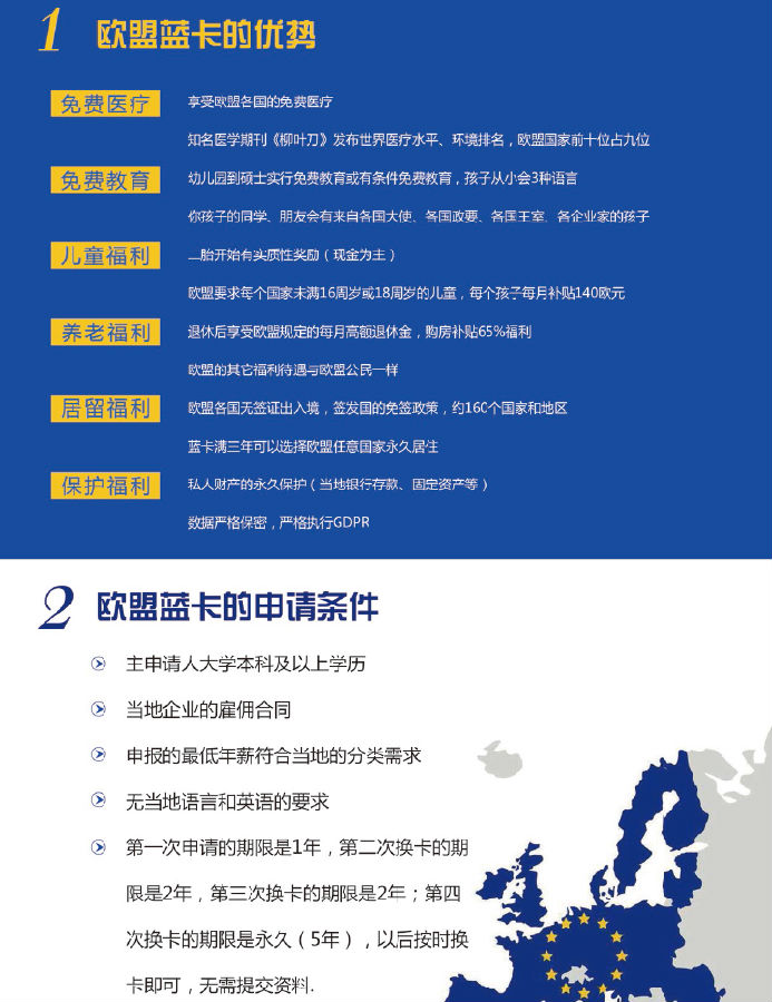 欧盟蓝卡:欧盟蓝卡是和美国绿卡类似的,是一种获得永居的方式,欧盟蓝卡的持有者是可以享受欧盟的各种福利待遇。