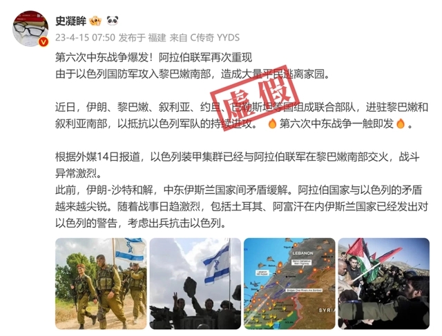 在各中文社交平台、门户网站及视频网站上,依照信息发布时间顺序进行溯源,目前能够找到的最早的说法源自4月15日——微博用户“史凝眸”援引未具名消息称,“以色列国防军攻入黎巴嫩南部,第六次中东战争爆发,阿拉伯联军再次重现”,并附上了4张图片。