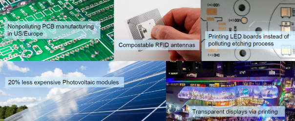 其产品是高性能、低成本、快速制造的环保型导电墨水,使印刷电子产品具有普遍导电性,为光伏、RFID及NFC天线、柔性电子、PCB、智能织物、嵌入式电路(物联网)等领域的添加剂印刷提供一种经济高效且可持续的解决方案。