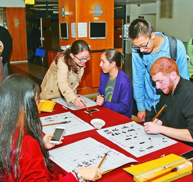- 以色列著名学府耶路撒冷希伯来大学7日在该校图书馆举办第三届孔子学院日活动,主题为“中国人的健康之道”,包括中医讲座、茶道、气功体验、武术表演、书法练习、象棋对弈等项目。活动吸引了该校师生和不少校外的中国文化爱好者,有的还主动做志愿者,向大家传授技艺。此次活动还邀请以色列中医养生专家为大家讲解养生之道。图为一些中国留学生在教当地学生练习毛笔书法。