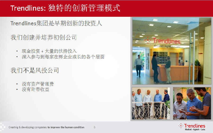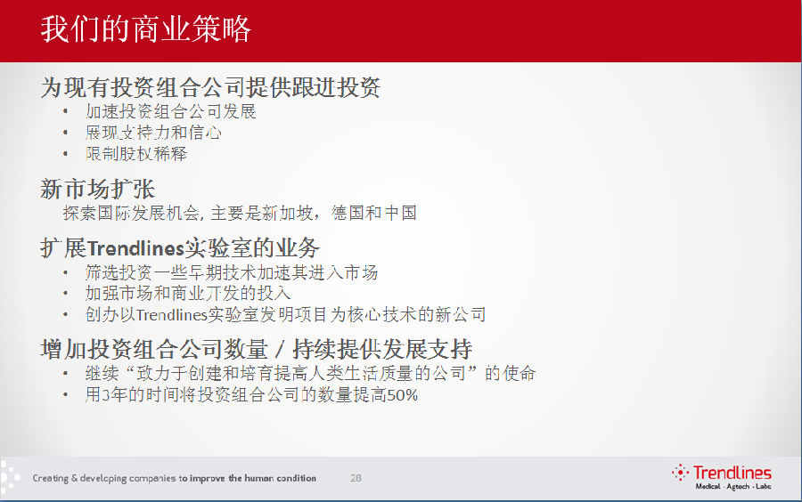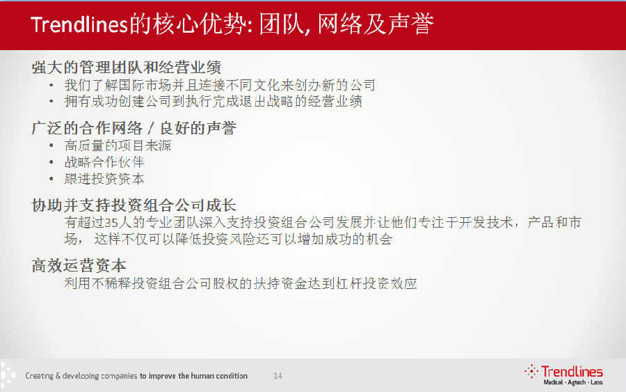 Trendlines有超过30多位的专职员工提供涵盖商业与技术开发 ,市场营销,投融资,金融,会计,法律与行政支持等服务同时依托于其强大的全球战略投资与专家团队,自 2007 年起就已为Trendlines 的投资组合公司融资超过 1.4 亿美金。