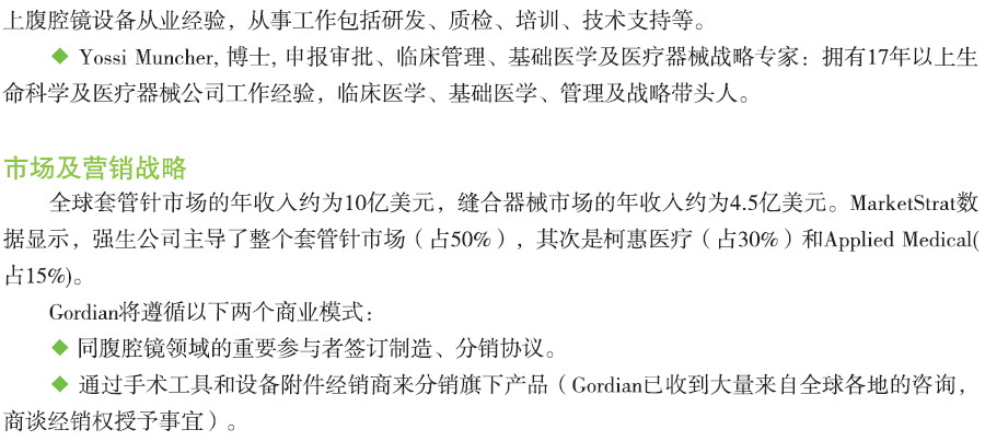 Gordian Surgical开发了一套带有集成缝合系统的套管针,为外科医生提供操作简单、安全可靠、节约成本的腹腔镜切口切开、缝合方案。Gordian特别设计的 “二合一”套管针,不在手术结束阶段缝入筋膜缝线,而是在手术开始阶段就自动将缝线缝入套管周围的组。套管移除后,医生将缝线打结,可轻易缝合筋膜。