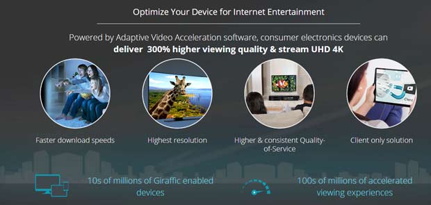 Giraffic 视频加速器是客户视频播放器或机顶盒上的一种简单的附加组件,使用该组件能够提供高清晰度的视频或自适应流,在网路拥塞的时候处于非绑定状态 - 在现有的互联网连接基础上为用户提供更高质量更流畅的视频流媒体。