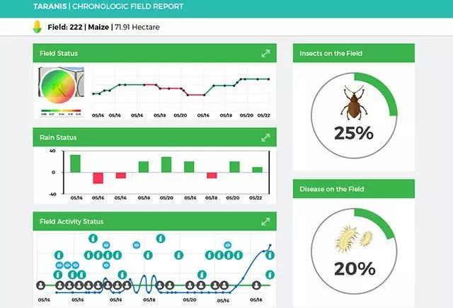 针对这样的情况,Taranis希望通过他们的平台改变传统的农田管理方式,借助大数据分析以及智能技术,帮助农民应对和解决作物病虫害防治以及天气等问题。