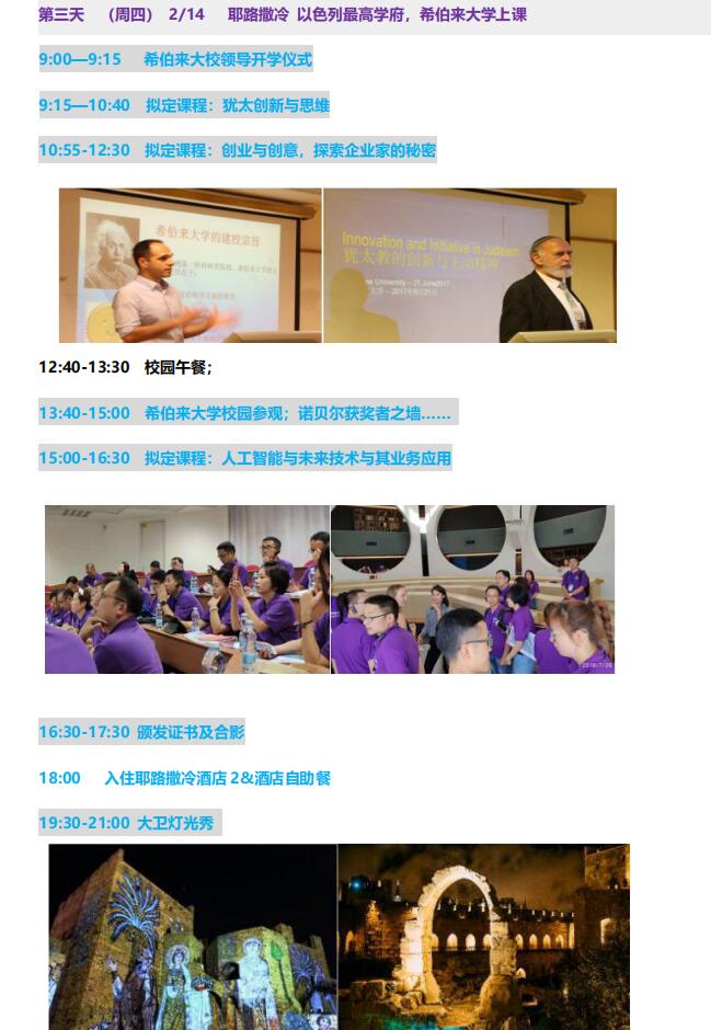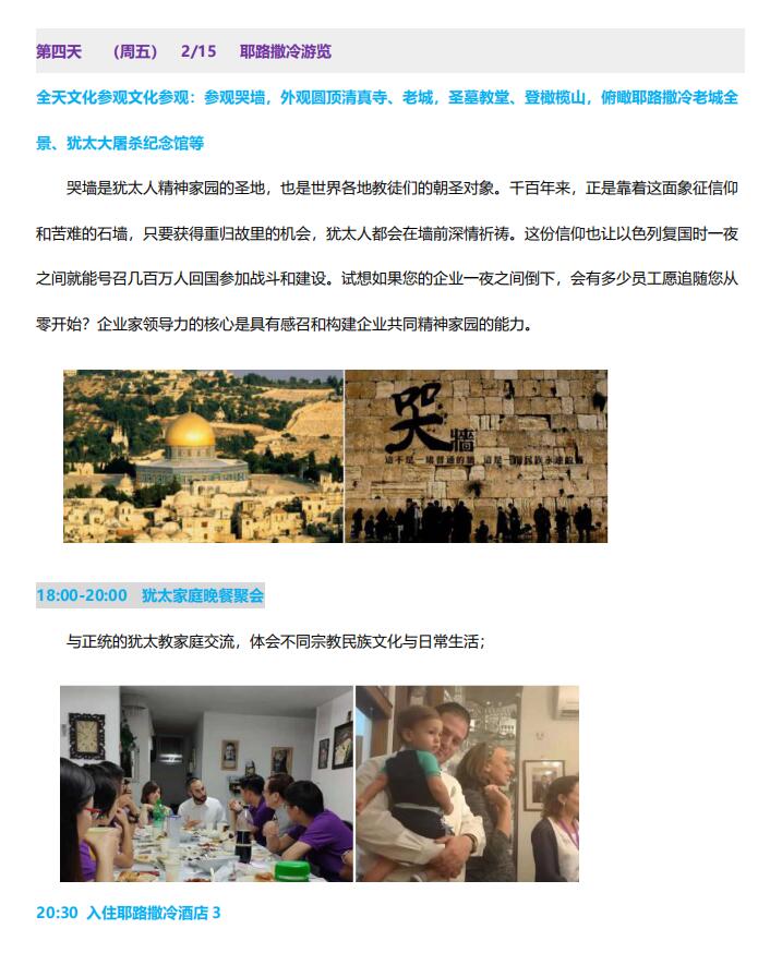 服务包括: 访问中所有活动体验、餐饮、交通、五星酒店双人间(如需单间另加6500 元)、签证办理、希伯来大学课程、企业参访、导游、司机、专业翻译、司 机、导游小费、矿泉水、境外意外保险、国际往返经济舱机票。