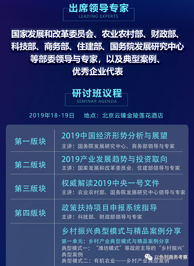 为深入贯彻落实党的十九大精神,前瞻解读2019年中国经济形势,重点探讨在“两个一百年”奋斗目标的历史交汇期和新中国成立70周年时代大背景下中国经济发展新方向,深度解读2019年中央一号文件与乡村振兴最新政策,由国研智库(国研文化传媒集团)指导,以“2019年中国经济形势、政策走向及乡村振兴战略权威解读”为主题的中国经济形势展望与乡村振兴高级研讨班,将于2019年1月18-19日在北京举行。