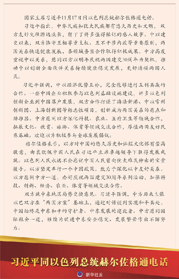 习近平指出,中华民族和犹太民族都有悠久历史和文明,双方友好交往源远流长,留下了许多值得铭记的感人故事。中以建交以来,双方恪守互相尊重主权、互不干涉内政等重要原则,两国关系快速健康发展,各领域务实合作取得积极成果。中方高度重视中以关系,愿同以方以明年庆祝两国建交30周年为契机,推动中以创新全面伙伴关系持续健康稳定发展,更好造福两国人民。