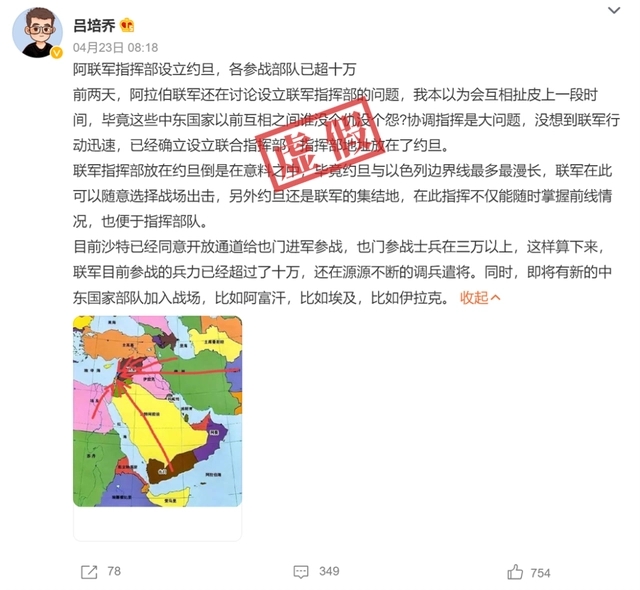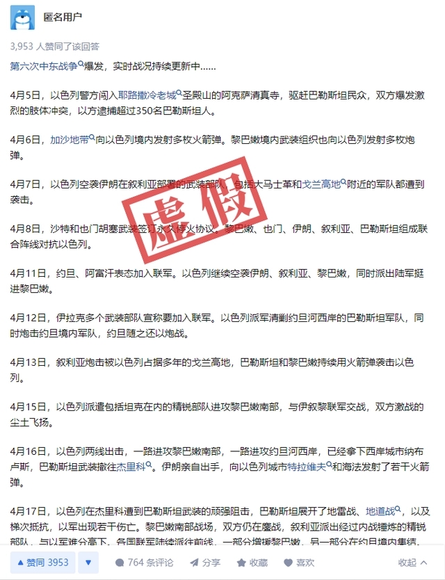 在各中文社交平台、门户网站及视频网站上,依照信息发布时间顺序进行溯源,目前能够找到的最早的说法源自4月15日——微博用户“史凝眸”援引未具名消息称,“以色列国防军攻入黎巴嫩南部,第六次中东战争爆发,阿拉伯联军再次重现”,并附上了4张图片。