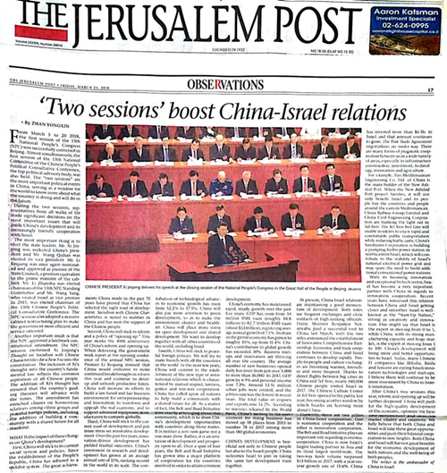 - 3月23日,驻以色列大使詹永新在以发行量最大的英文报纸《耶路撒冷邮报》发表署名文章《“两会”将促进中以关系发展》,介绍2018年全国两会情况及对深化中以创新全面伙伴关系带来的机遇。全文如下: